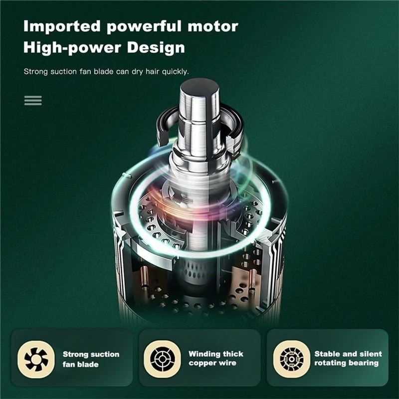 4. Motor poderoso importado, design de alta potência, lâmina de ventilador de sucção forte, motor potente importado importado importado, design de alta potência, lâmina de ventilador de sucção forte, pode secar o cabelo rapidamente.