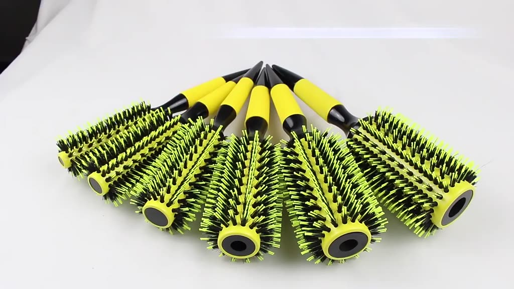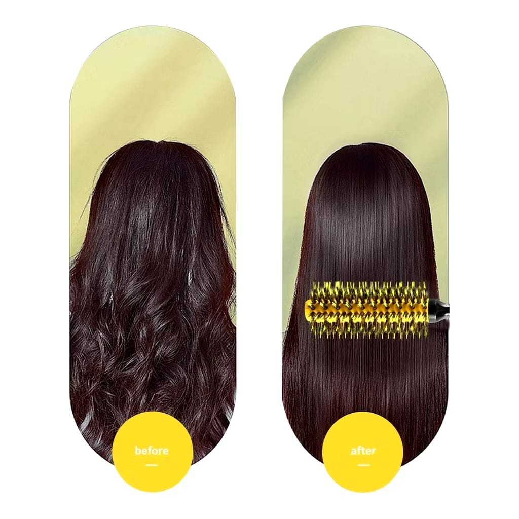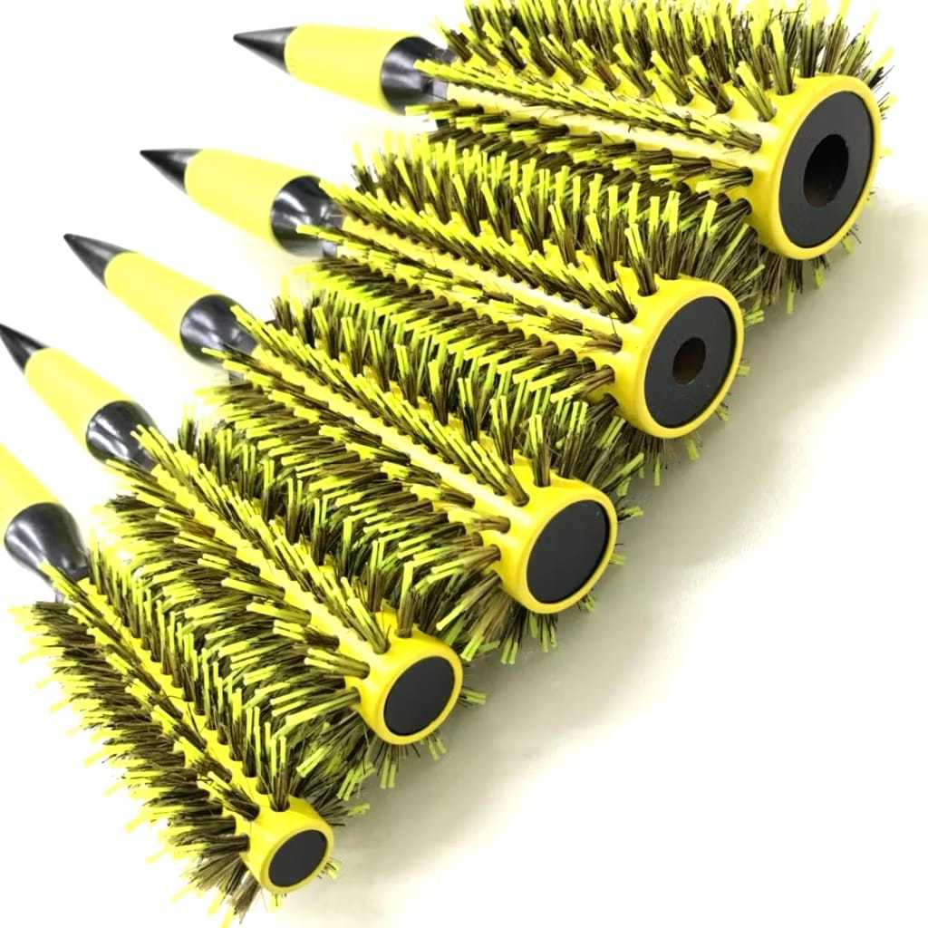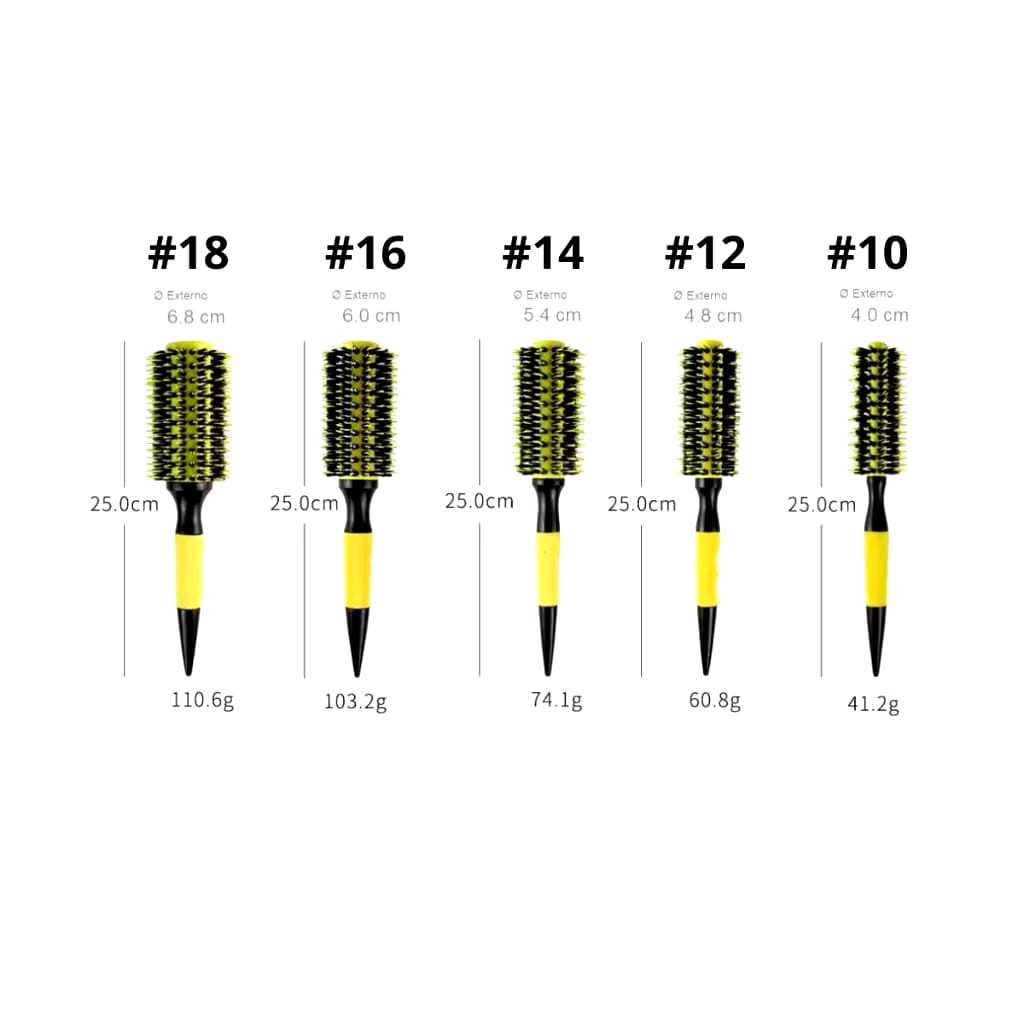 Escova Profissional Térmica, com base revestida em Cerâmica Amarela. Cerdas mistas dupla altura, de javali e nylon em "V", que proporciona maior tração na escovação. Ideal para cabelos mais crespos. Cabo em madeira laqueada preta, pontiagudo e anatômico, revestido em borracha, é ideal para alisar e modelar cabelos mais curtos.