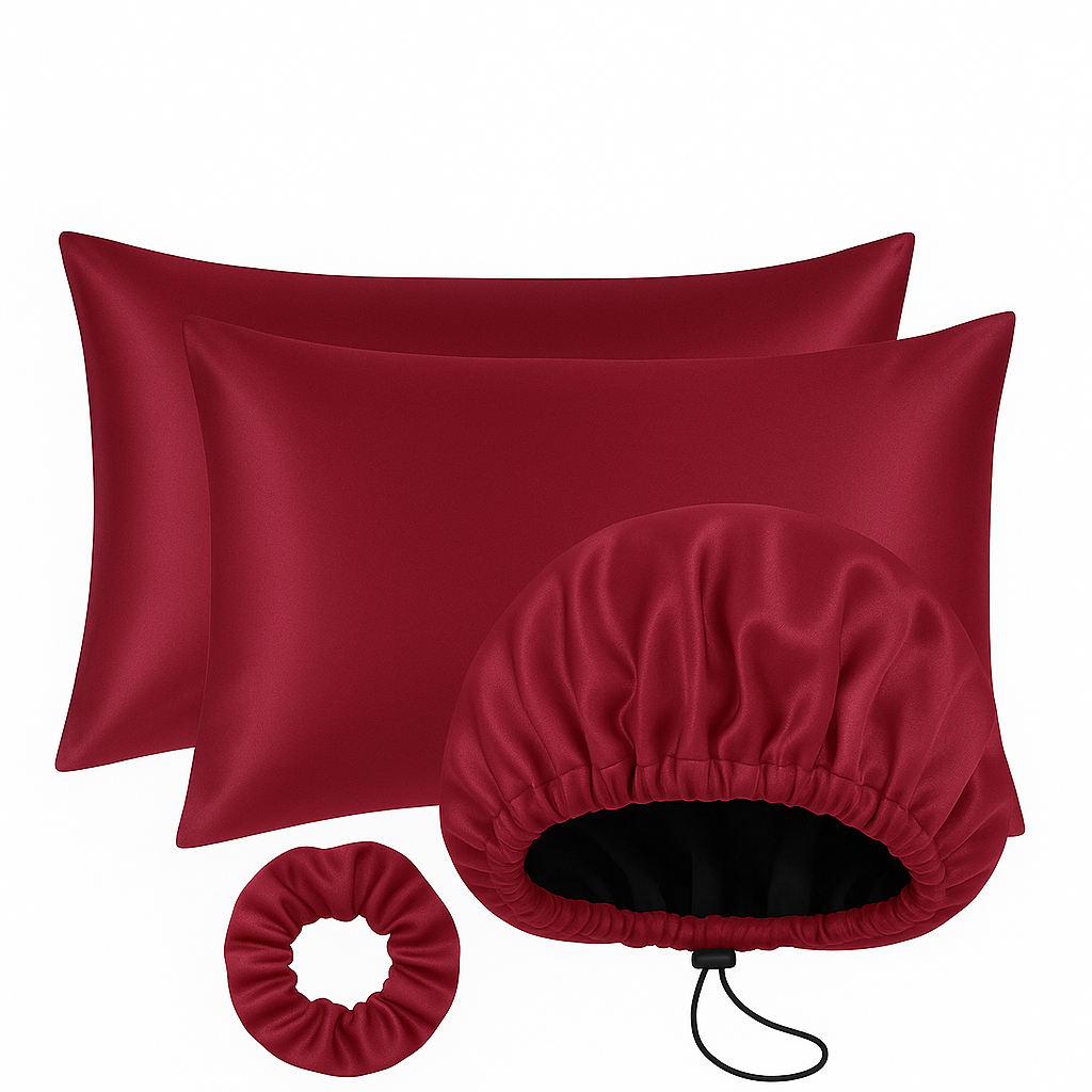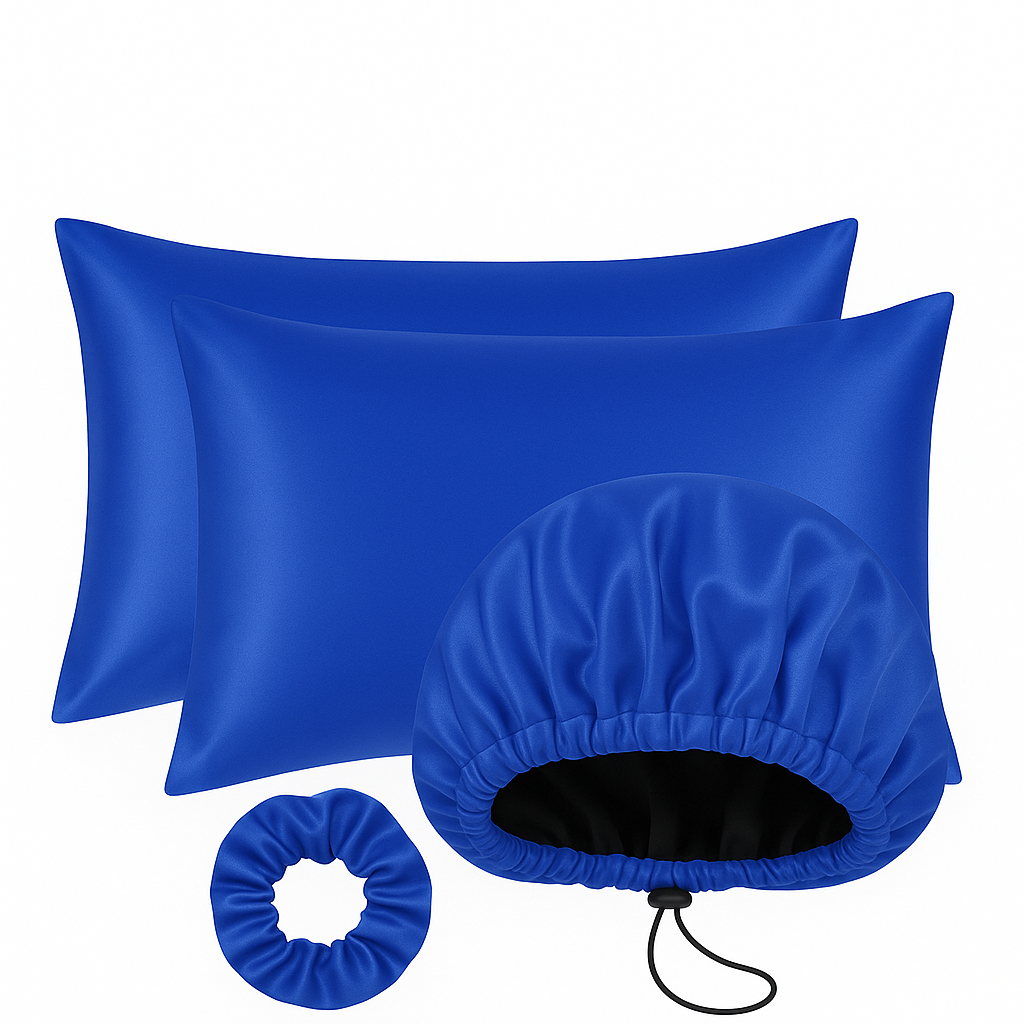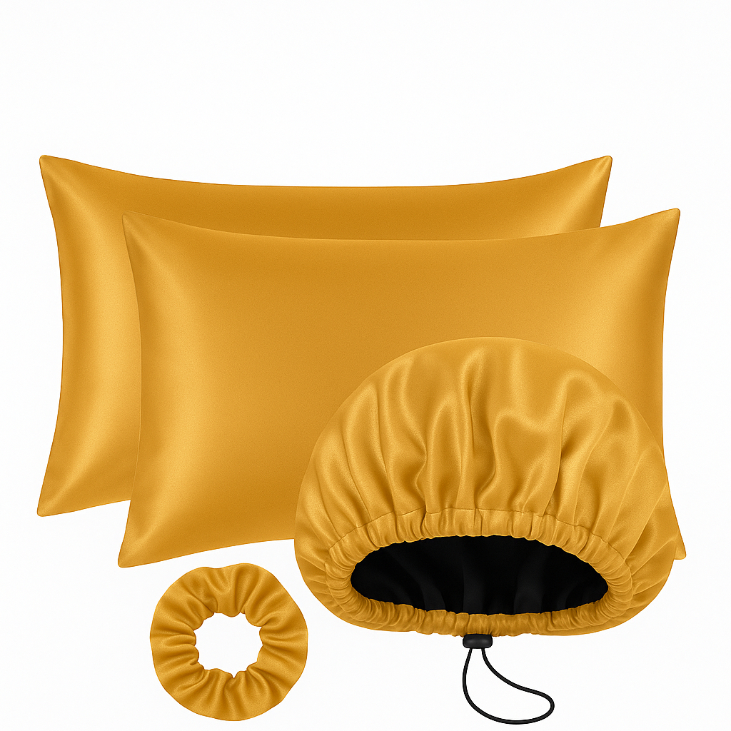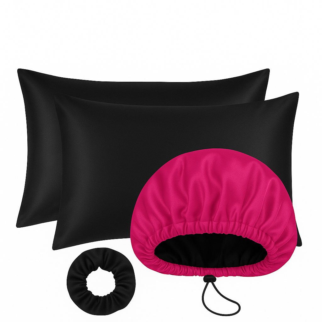 Kit Cetim Antifrizz 2 Fronhas 70x50+Touca Dupla Face Regulável+Scrunchie Elástico para Cabelo Cacheado e Liso