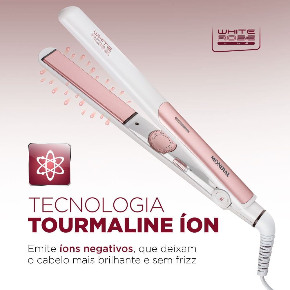 Cabelos com um liso mais saudável e cheios de brilho! A prancha White Rose P-50 tem revestimento cerâmico e com a tecnologia Tourmaline Íon, que cuida da saúde das mechas. Ao ser aquecido, o mineral Tourmaline libera íons, que fecham as cutículas dos fios, deixando as mechas mais macias, brilhantes e sem frizz. Além disso, o item chega a 220°, tem cabo 360° e é bivolt. Saiba mais sobre a prancha da Mondial: